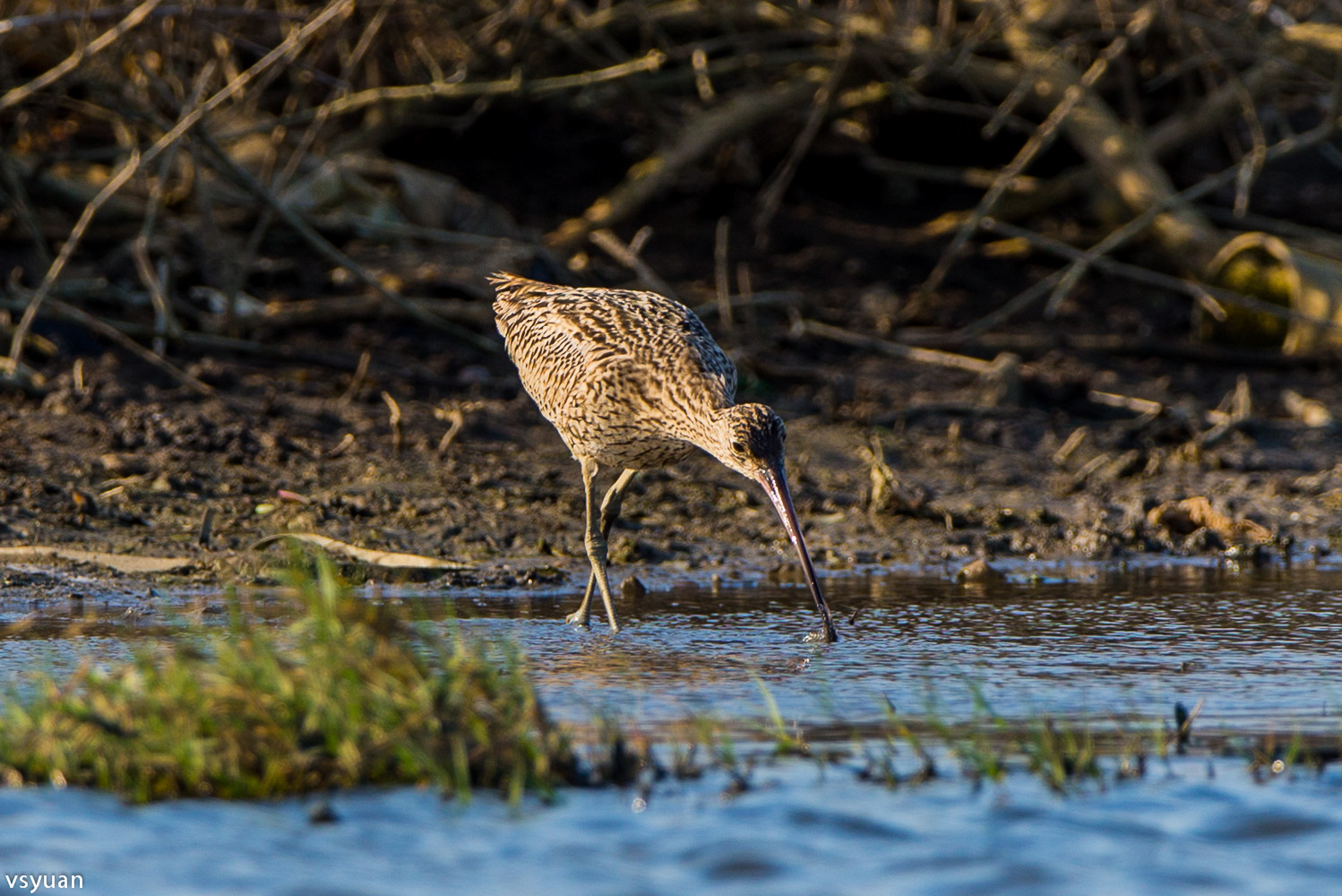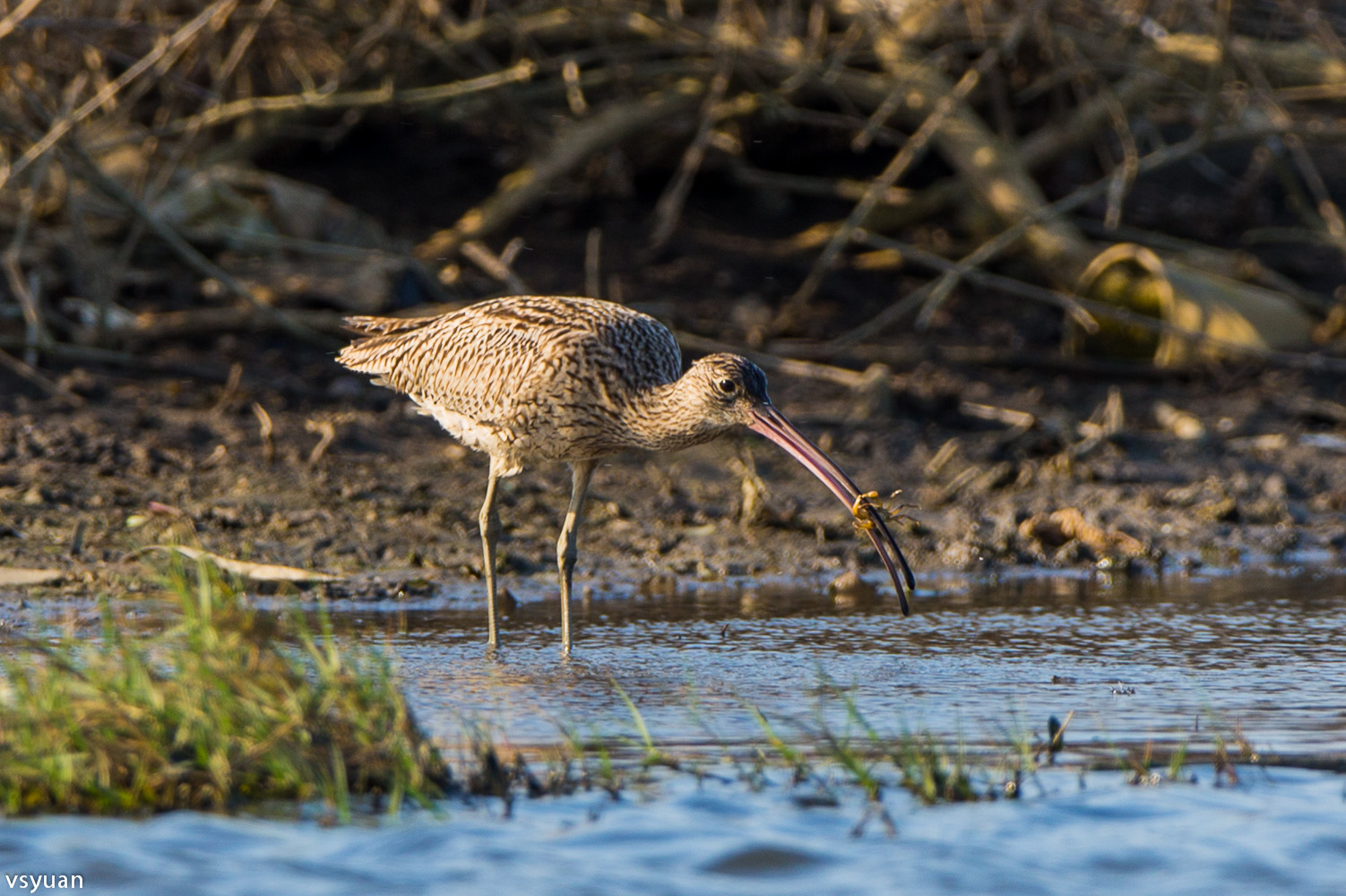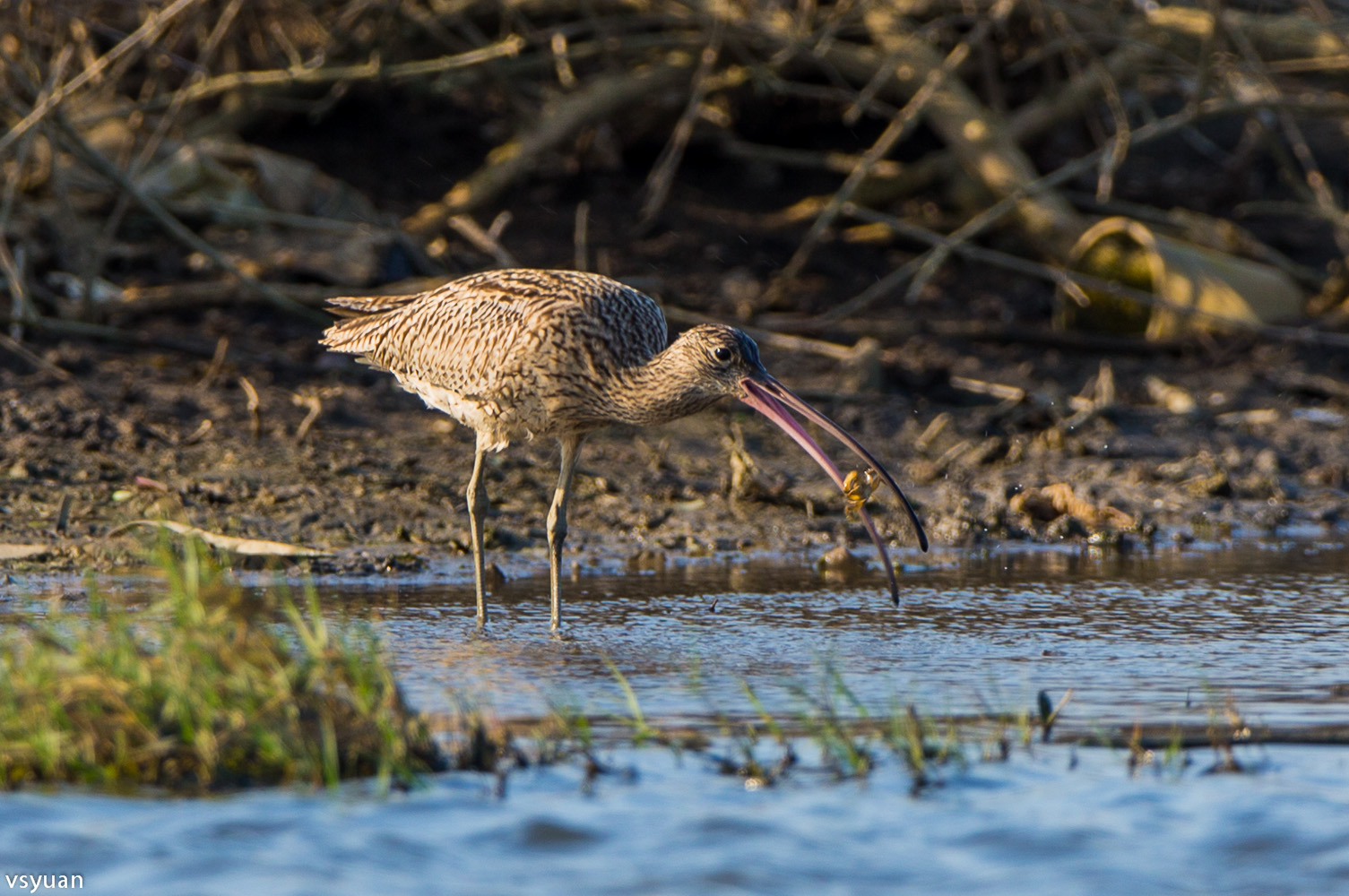看著黦鷸的長嘴一次次的插入淺灘污泥中尋找獵物,心想有個長嘴還真好用!看牠抓到獵物吞食