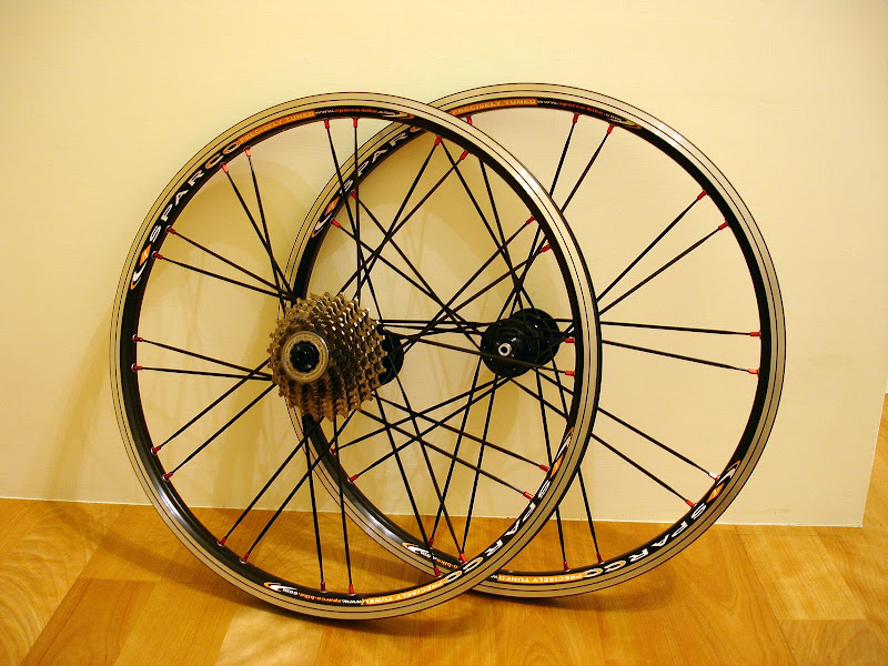 小白 mini 3上次升級之後,整體上的性能超乎我的預期的好,騎過的都稱~讚!!自己也滿意的不得了!至今升級約10個月以上的時間了,小白 mini 3依然英氣十足,但是有一天網友丟一則網頁資料過來讓我看,某單車二手交流區的Sparco-V20 Eliet 20"輪組,仔細看才1241g...輕喔!還配紅色鋁頭、扁鋼絲(前20後24),造型還不錯看喔!賣家賣7000元小貴,原價7700元,不管是否有用過,就算沒用過一手當然會有折舊價,就跟賣家小殺了一下,6000元成交...呵呵